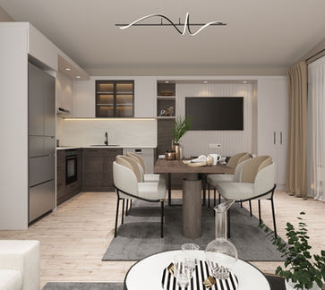 Açık mutfak ile yaşam alanının bir arada olduğu düzen, mekânı hem daha geniş hissettiriyor hem de aile içi kullanımda büyük kolaylık sağlıyor.